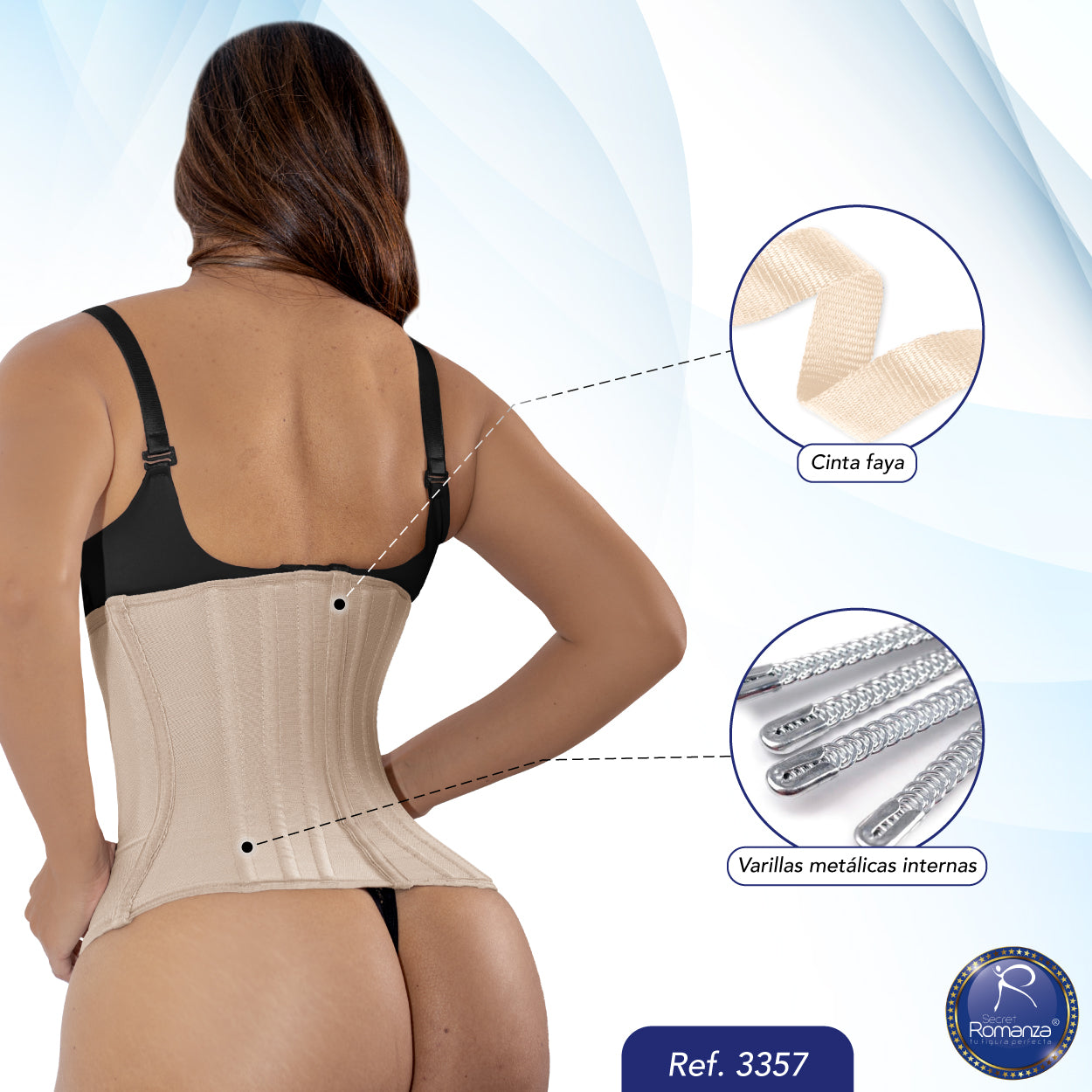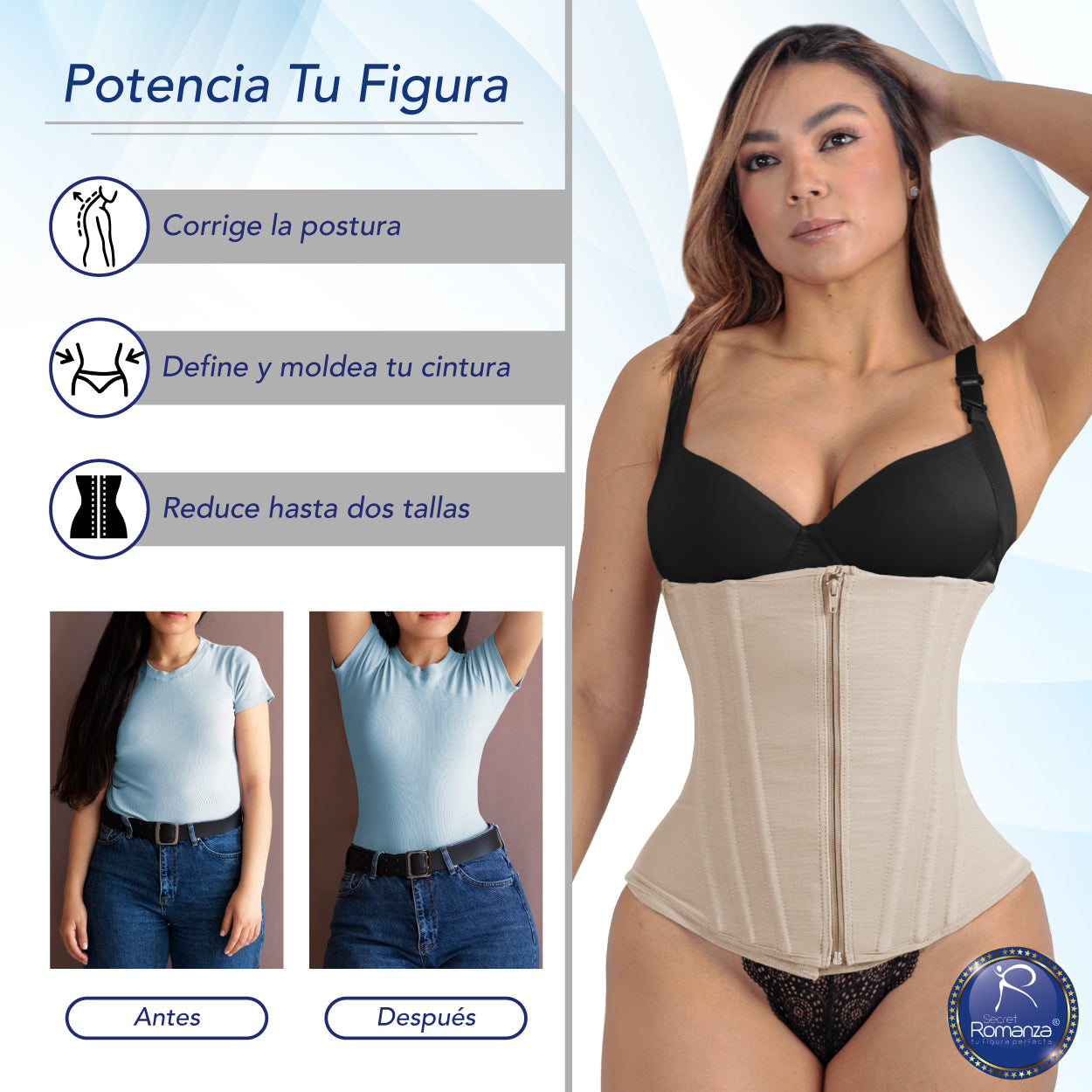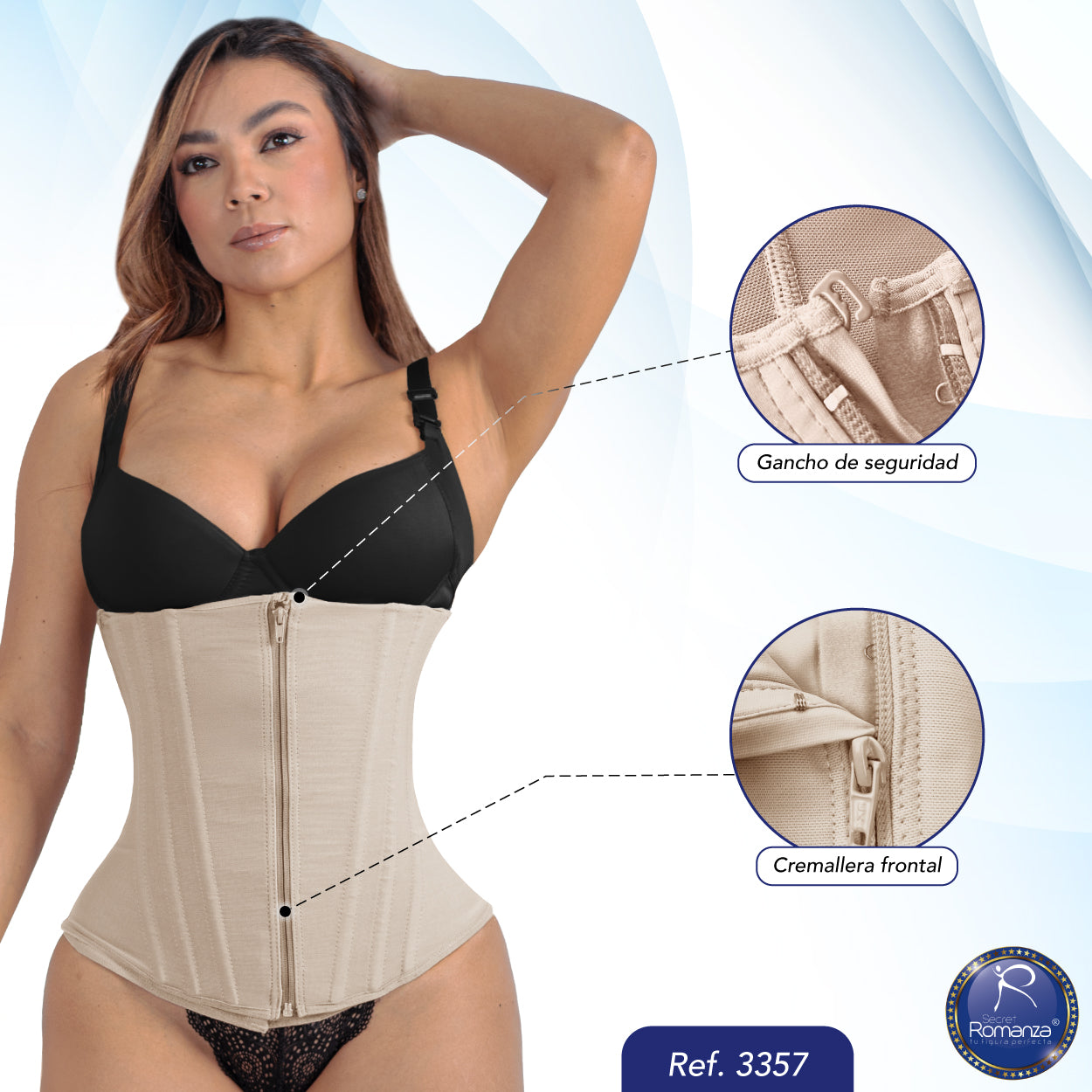 Faja cinturilla que brinda una silueta reloj de arena, fabricada en Powernet. Cuenta con 14 varillas, tres líneas de broches frontales y zipper en recubrimiento externo, para una mayor compresión.