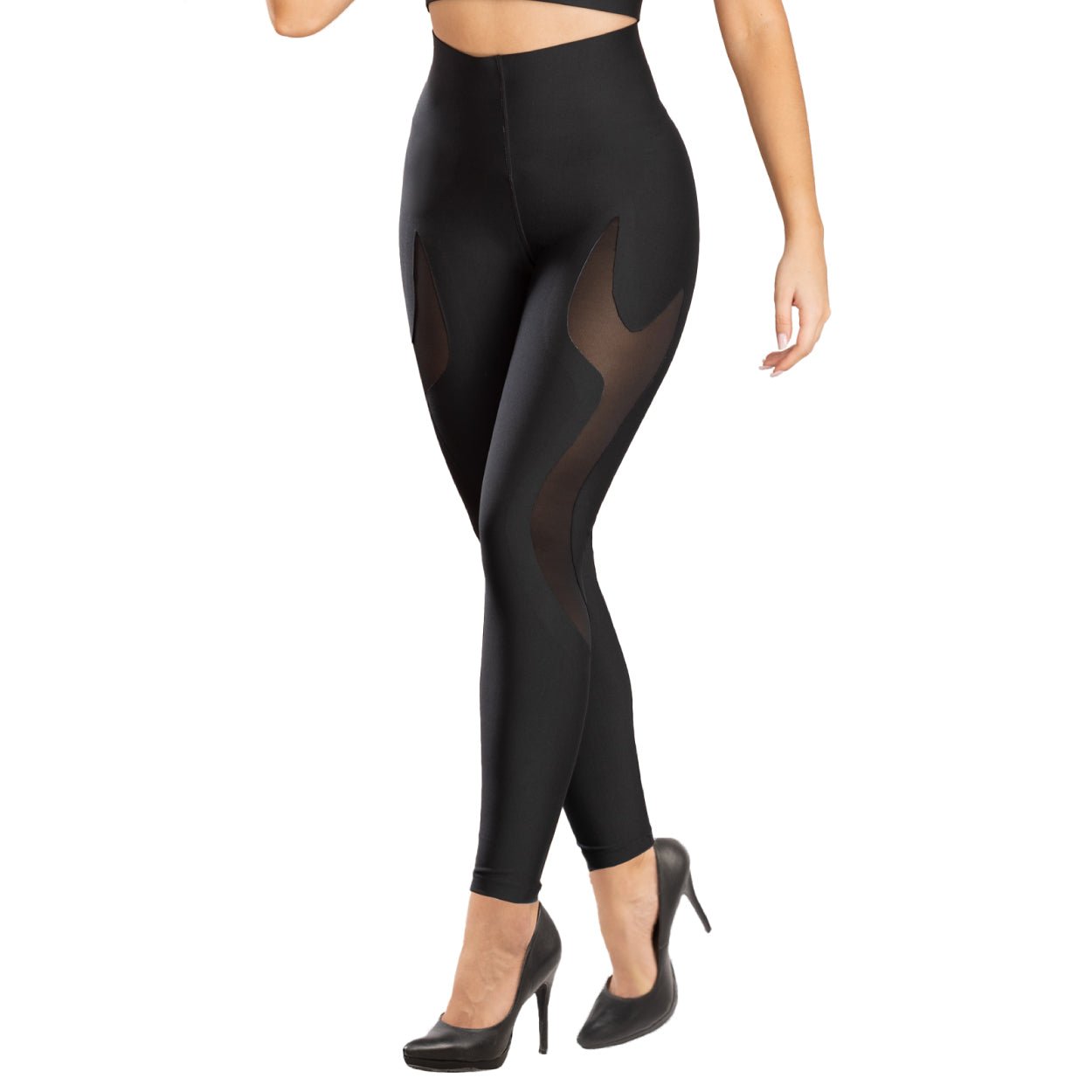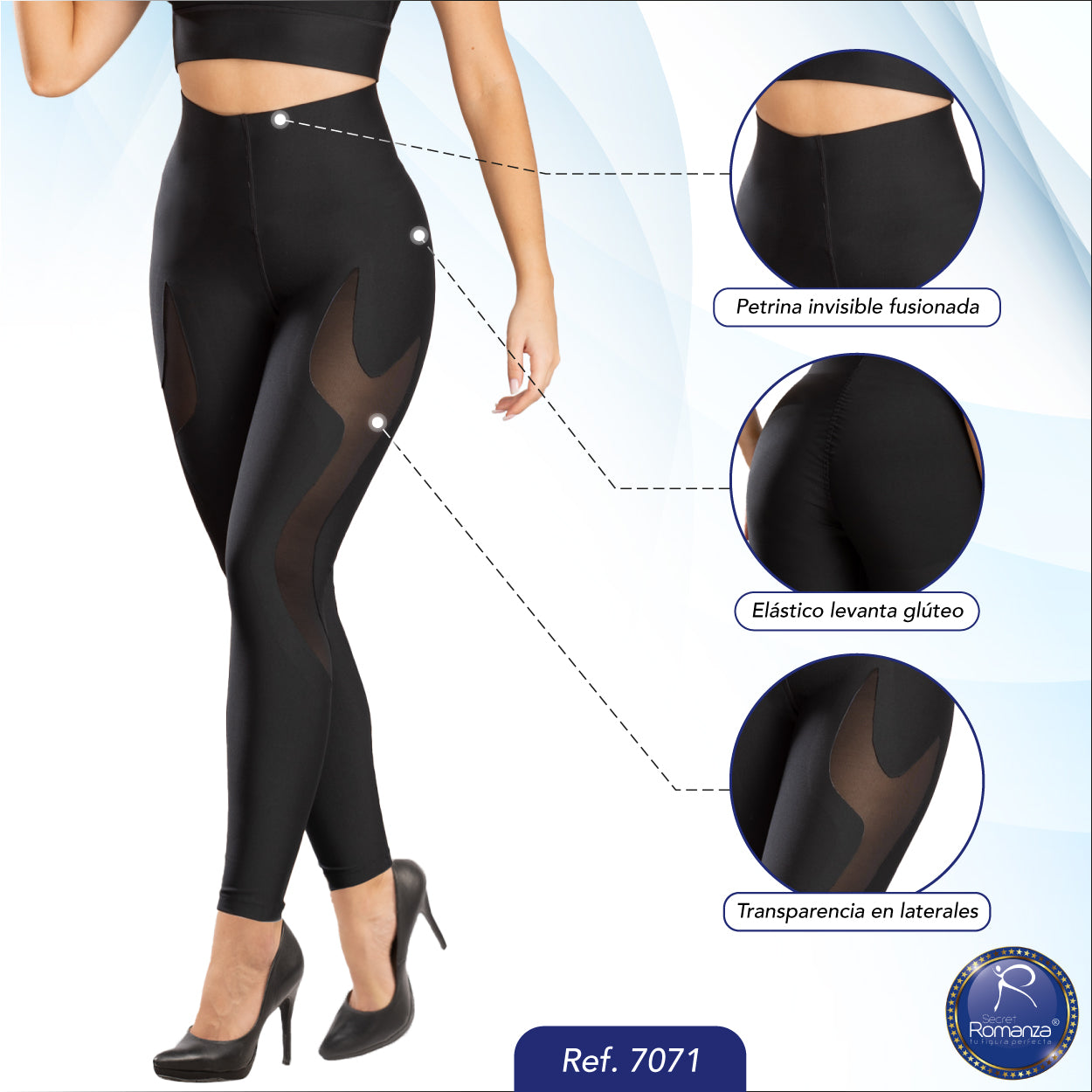 Leggins casual con pretina invisible, transparencias en los laterales y recogido en glúteo con elástico levanta cola que realza la figura y aporta un toque moderno al diseño.