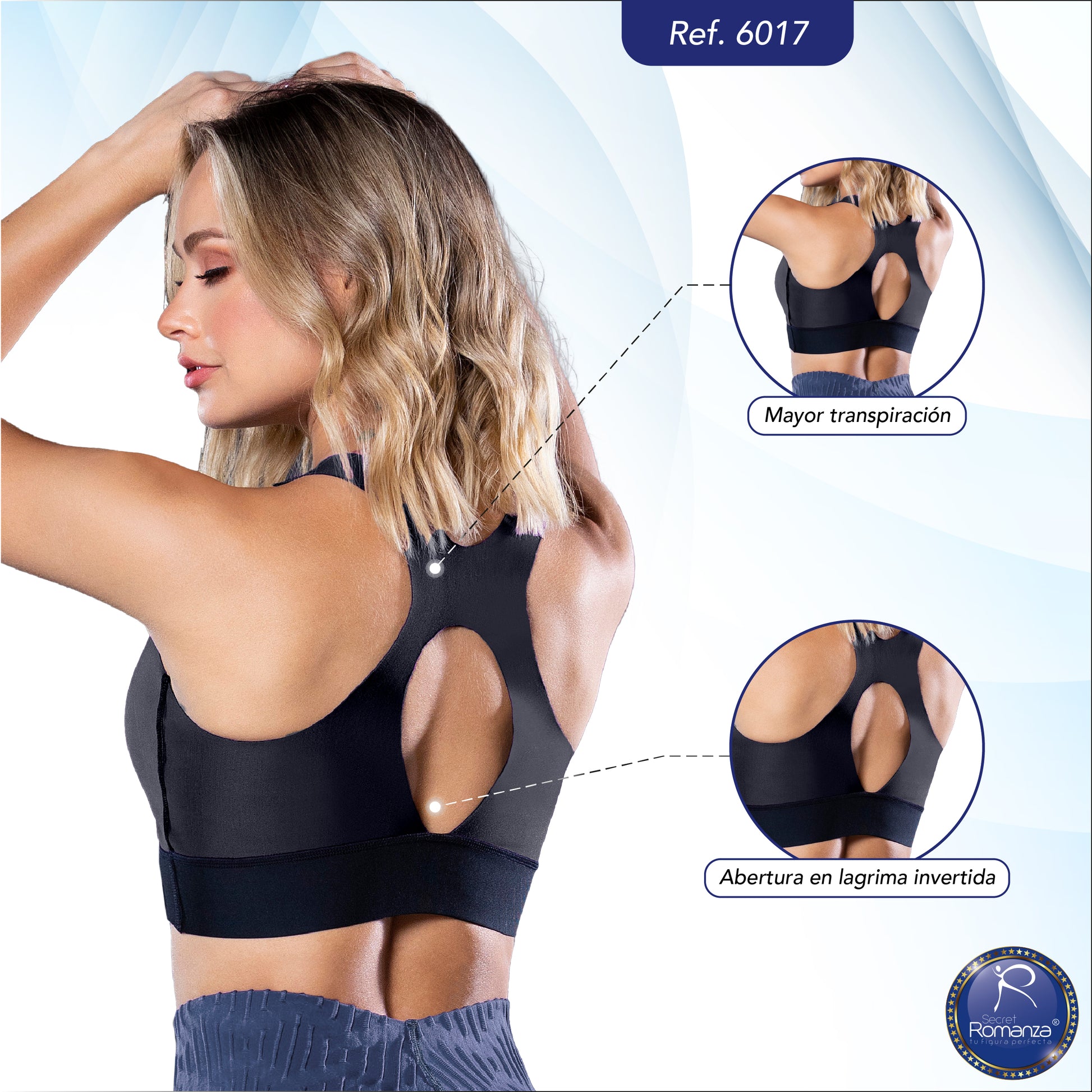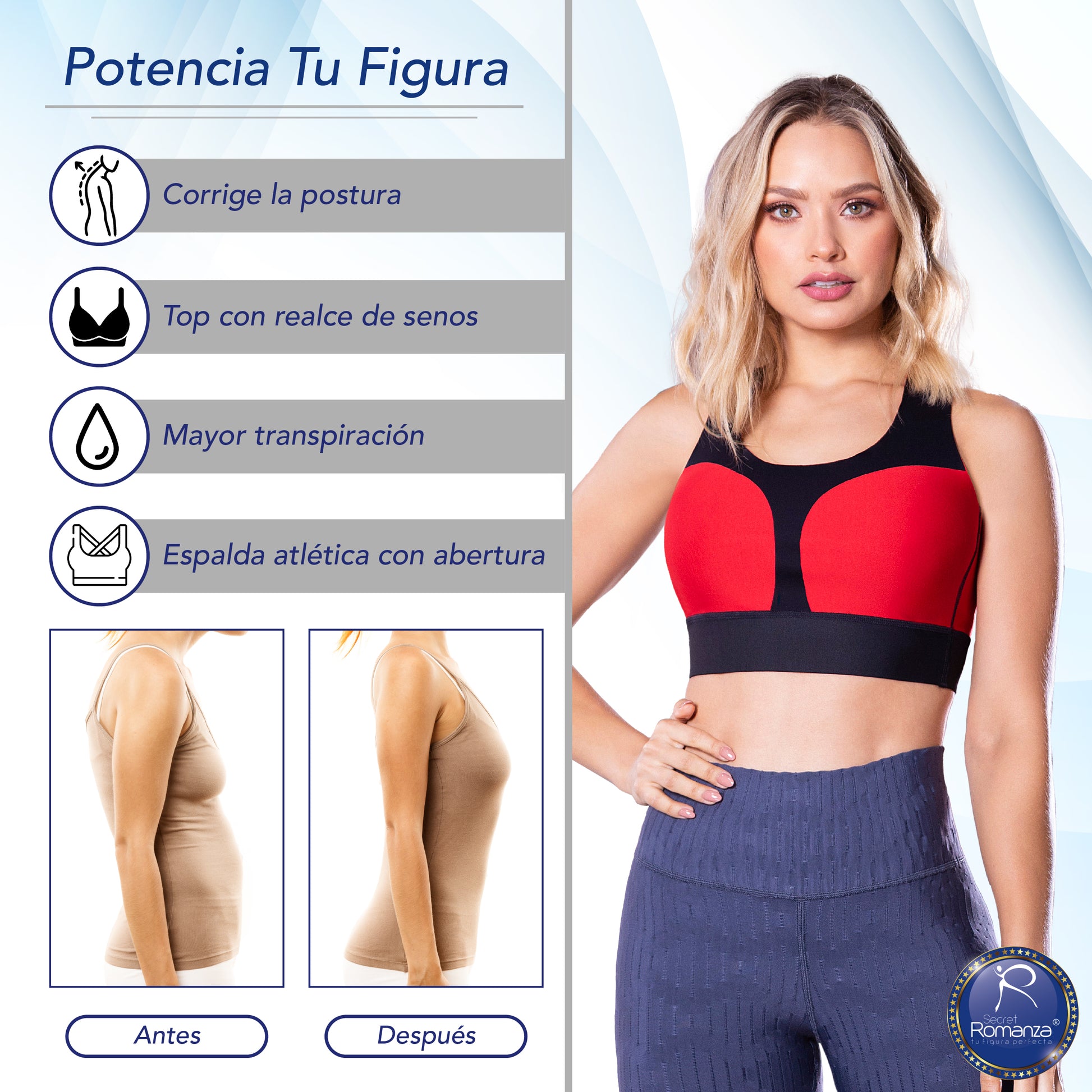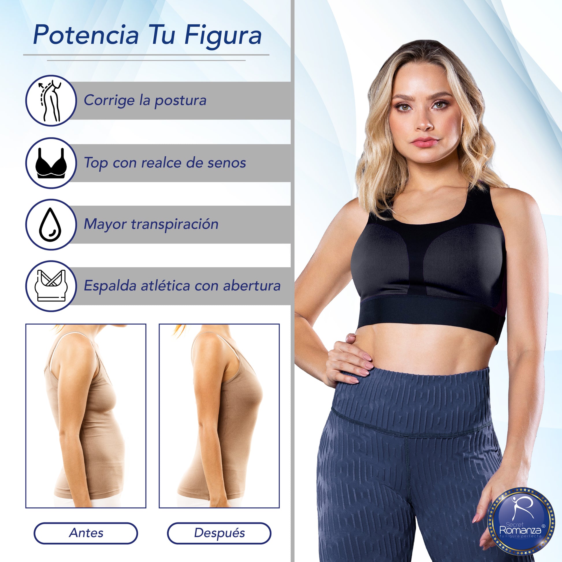 Realza el busto, mejora la postura y ofrece comodidad y frescura durante el movimiento.