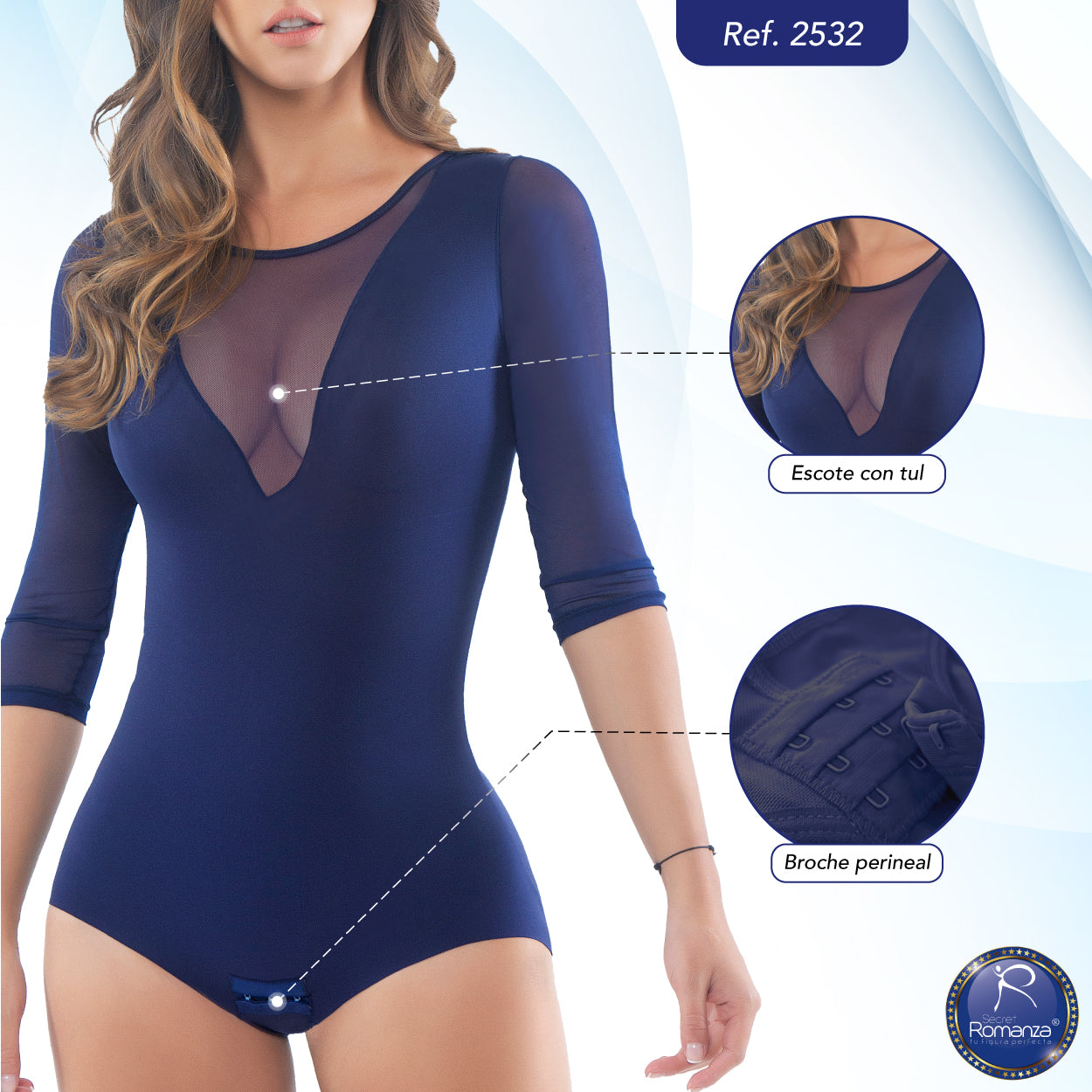 Body exterior con control, Cuenta con mangas tres cuartas y escote transparente frontal en tul.