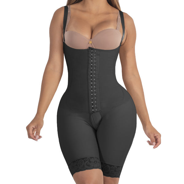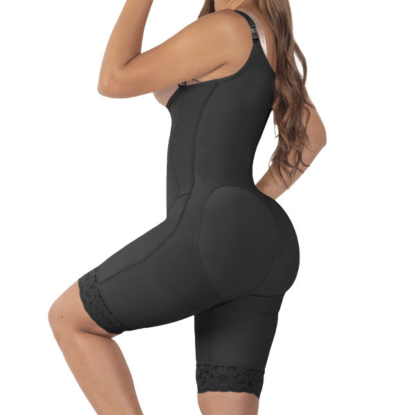 Faja a la rodilla senos libres con espalda alta, hecha en Powernet. Encaje siliconado en las piernas. Abertura completa desde la base del busto con 3 líneas de broches frontales y abertura en la parte perineal. Realza los Glúteos con su diseño en forma de corazón, tirantes graduables y removibles.