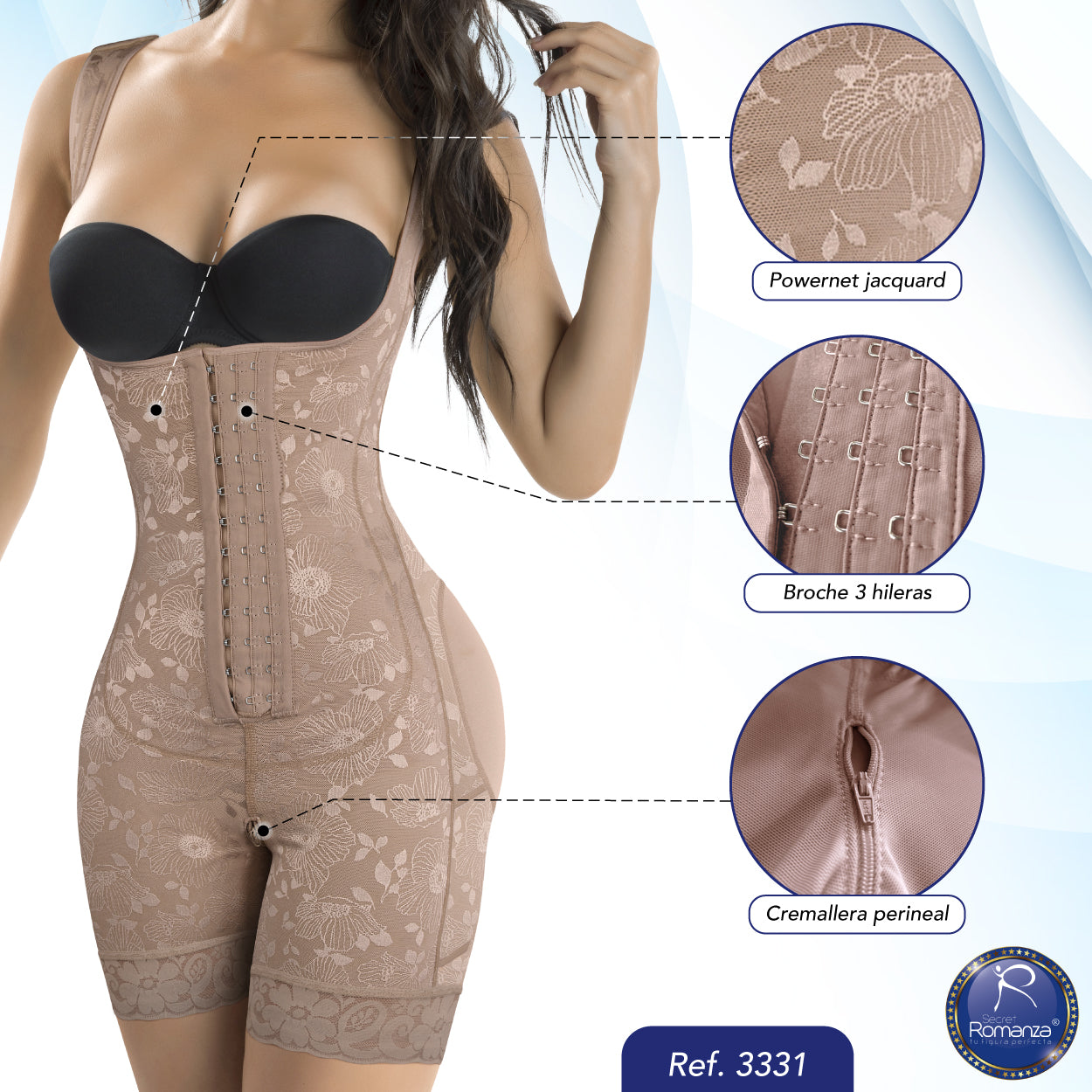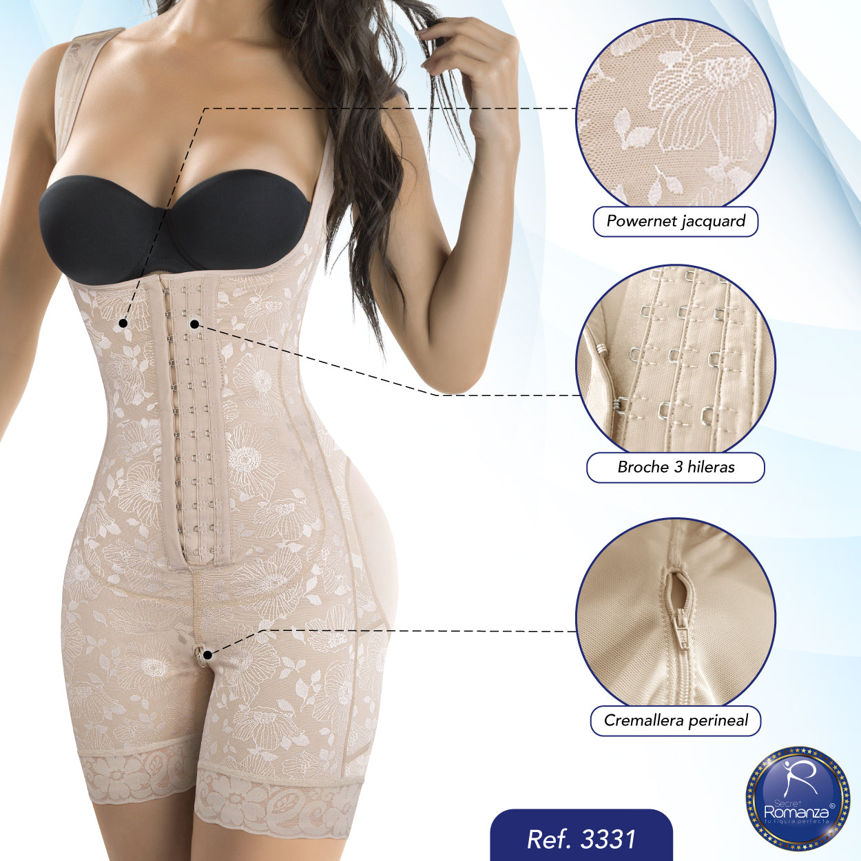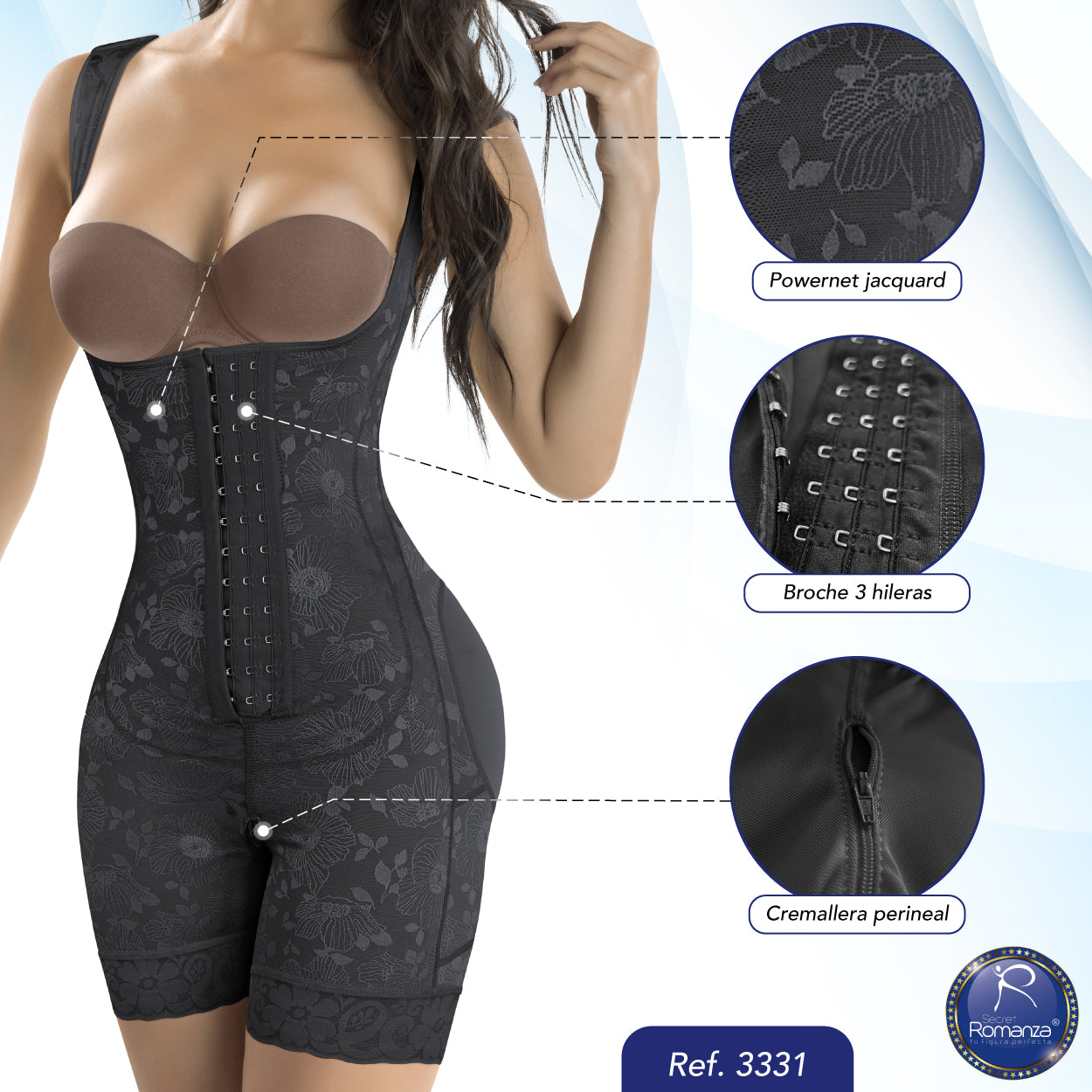 Faja short Senos libres Fabricado en Powernet Jacquard, Cuenta con encaje siliconado en piernas, tirantes ajustables con broches en hombro, 3 líneas de broches graduables y cremallera perineal para facilitar su uso.