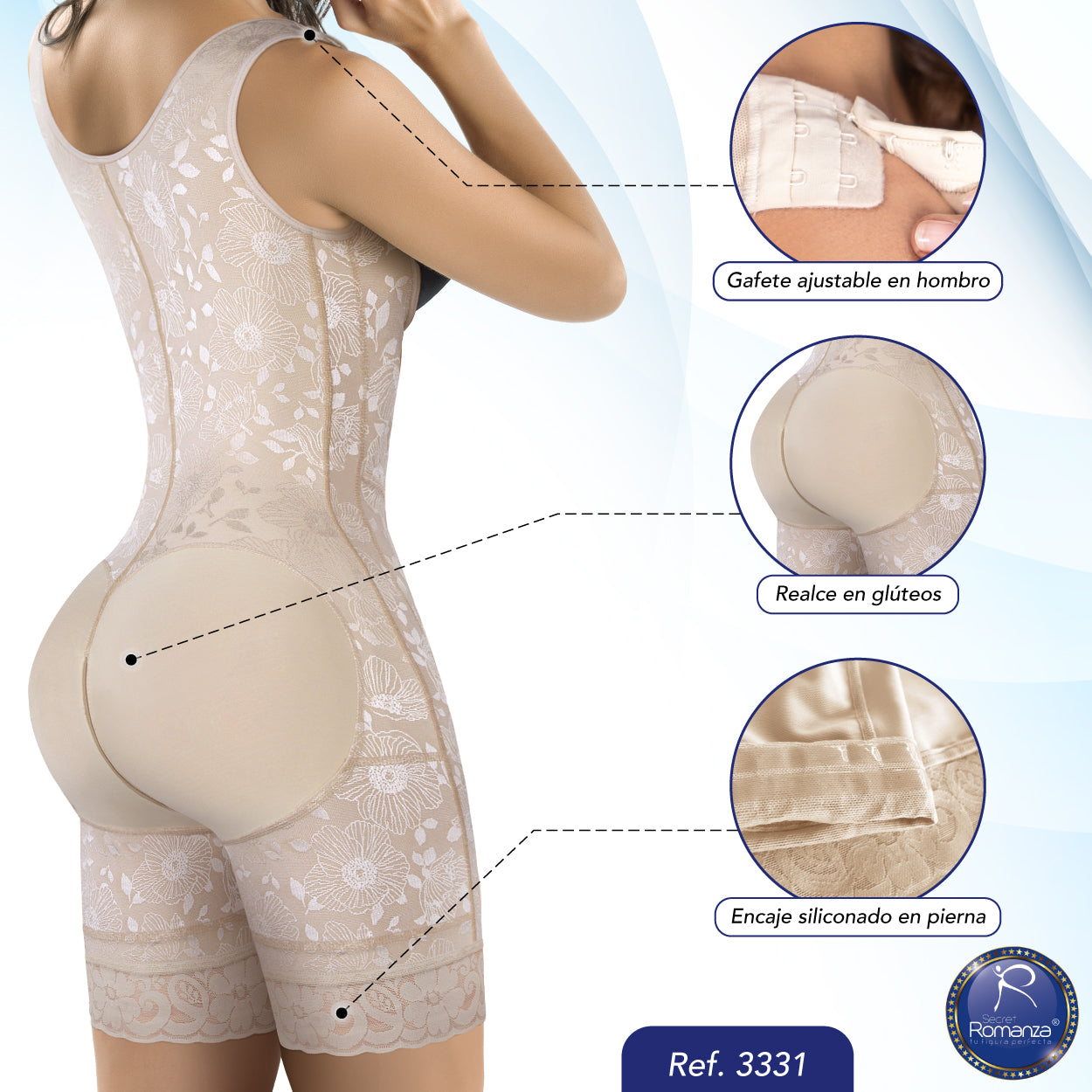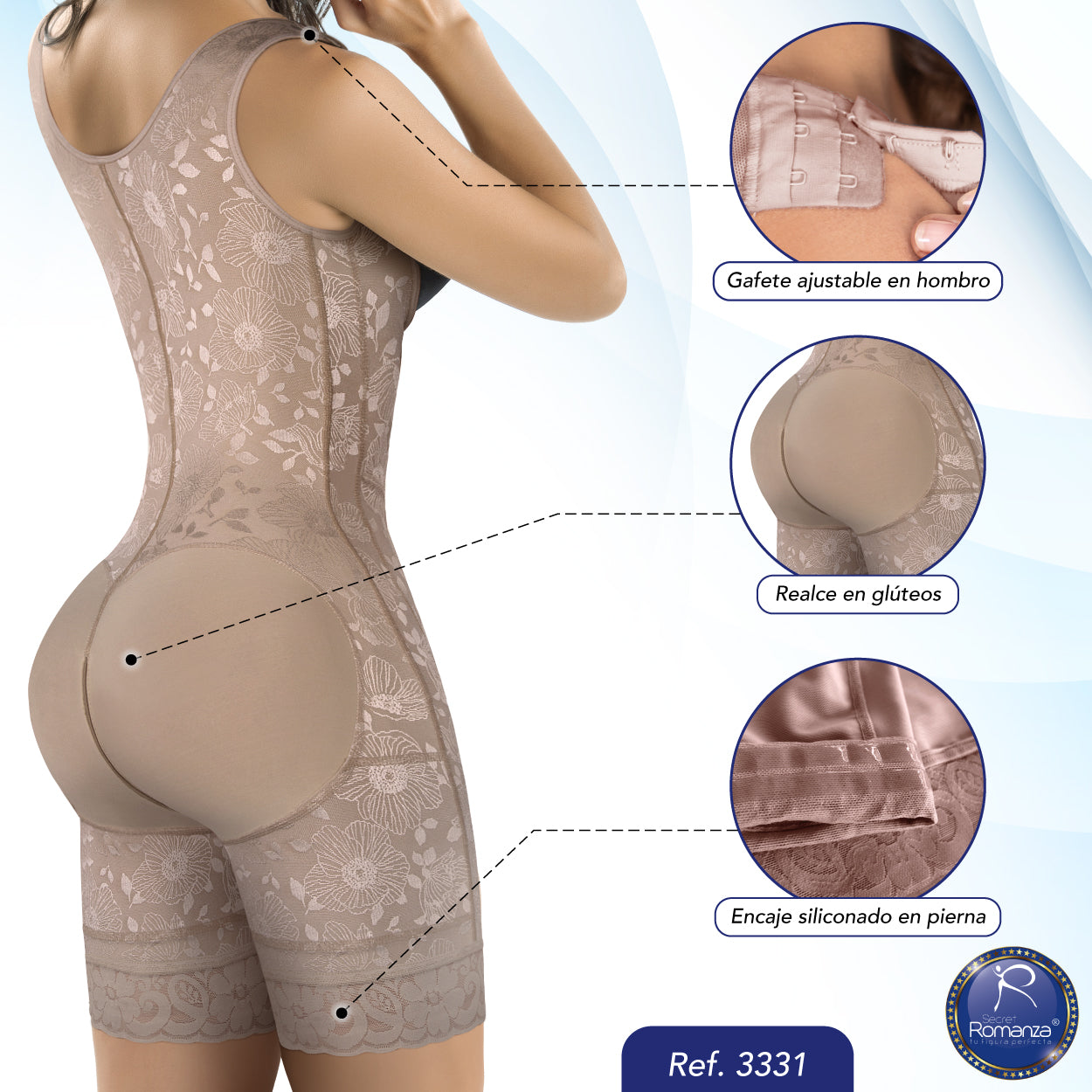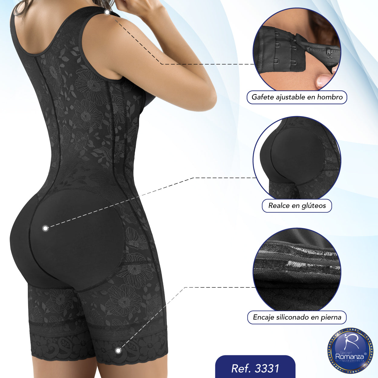 Faja short Senos libres Fabricado en Powernet Jacquard, Cuenta con encaje siliconado en piernas, tirantes ajustables con broches en hombro, 3 líneas de broches graduables y cremallera perineal para facilitar su uso.