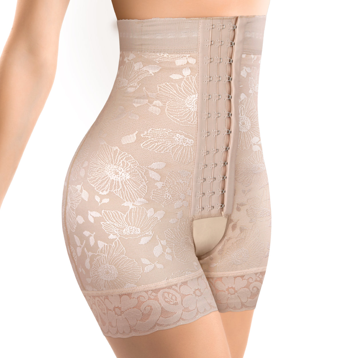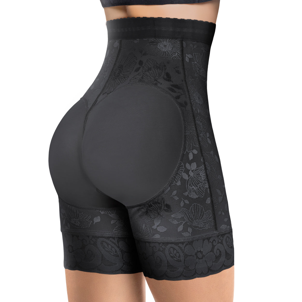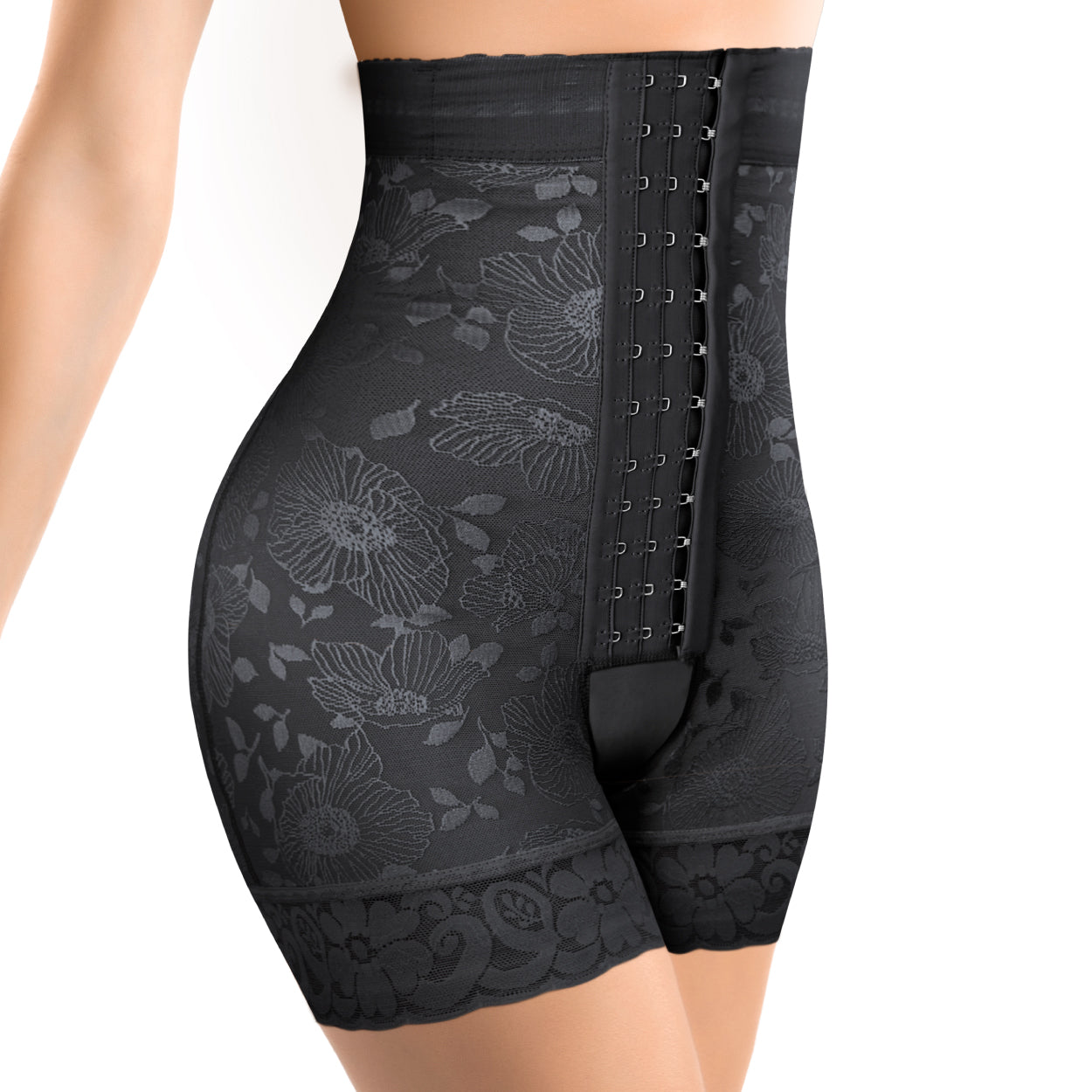Short cintura alta, Fabricado en Powernet Jacquard de alta compresión y elasticidad, forro interno de microfibra y tacto suave, Su diseño en forma de corazón ayuda a realzar los glúteos. Cuenta con elástico siliconado en cintura con refuerzo de varillas plásticas, 3 líneas de broches frontales, encaje siliconado en pierna, abertura perineal para facilitar su uso.