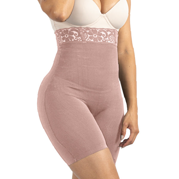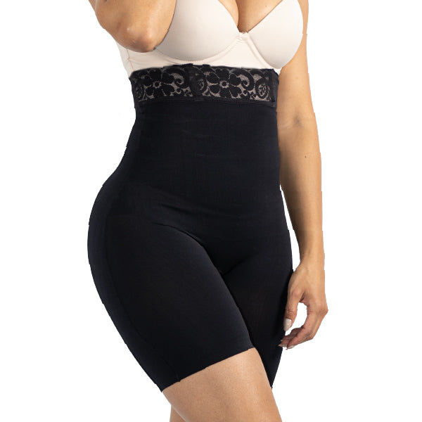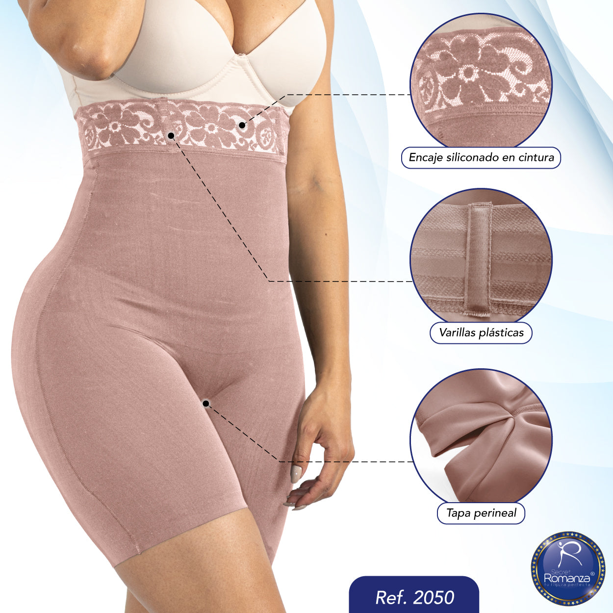 Brinda la compresión necesaria al abdomen y cintura. Realza los glúteos, es semi invisible y 99% sin costuras.