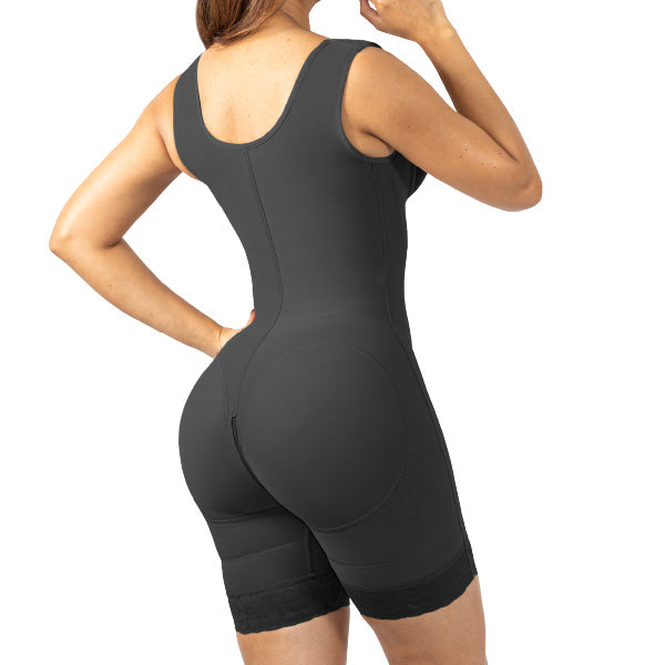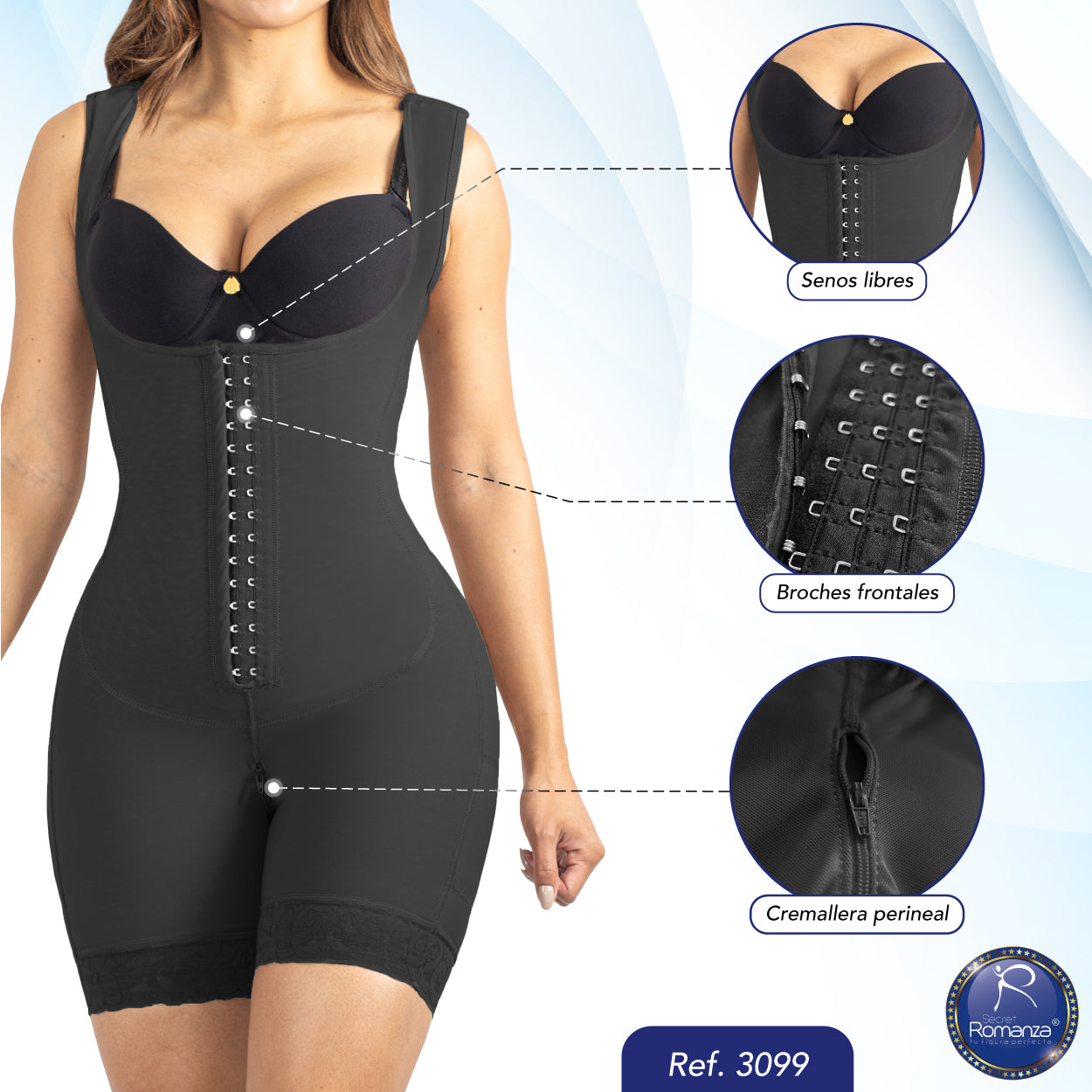 Faja short postquirúrgico con senos libres. Encaje siliconado en las piernas, tirantes con broches son ajustables en el hombro. Cuenta con 3 líneas de broches graduables en la parte delantera y cremallera en la zona perineal.