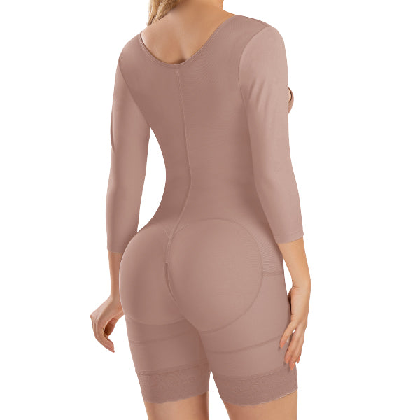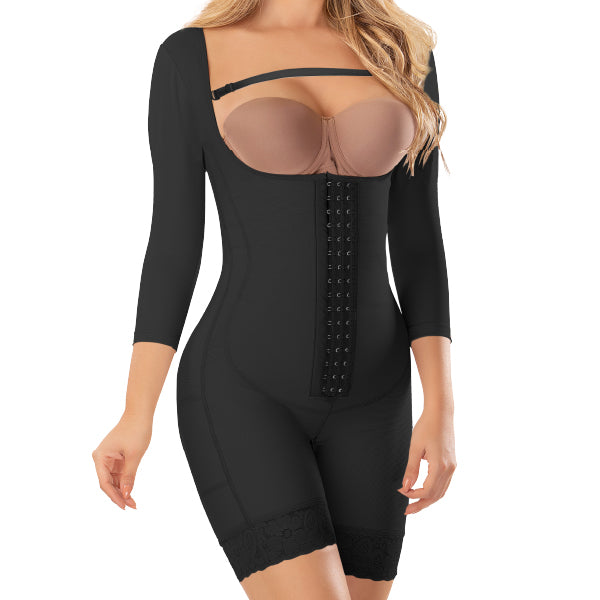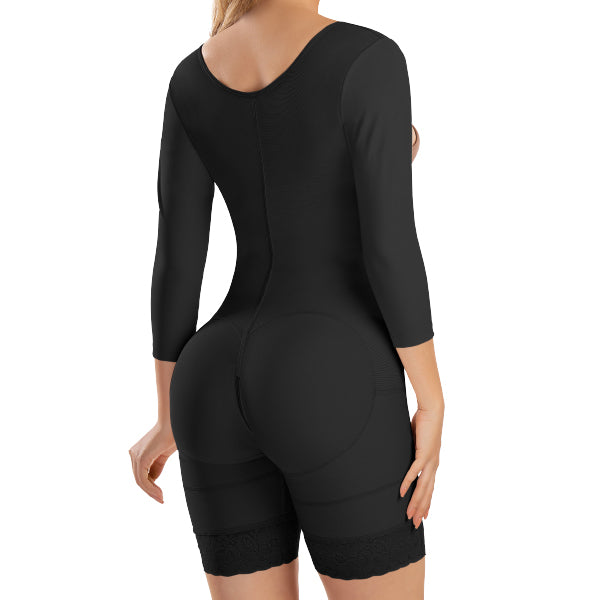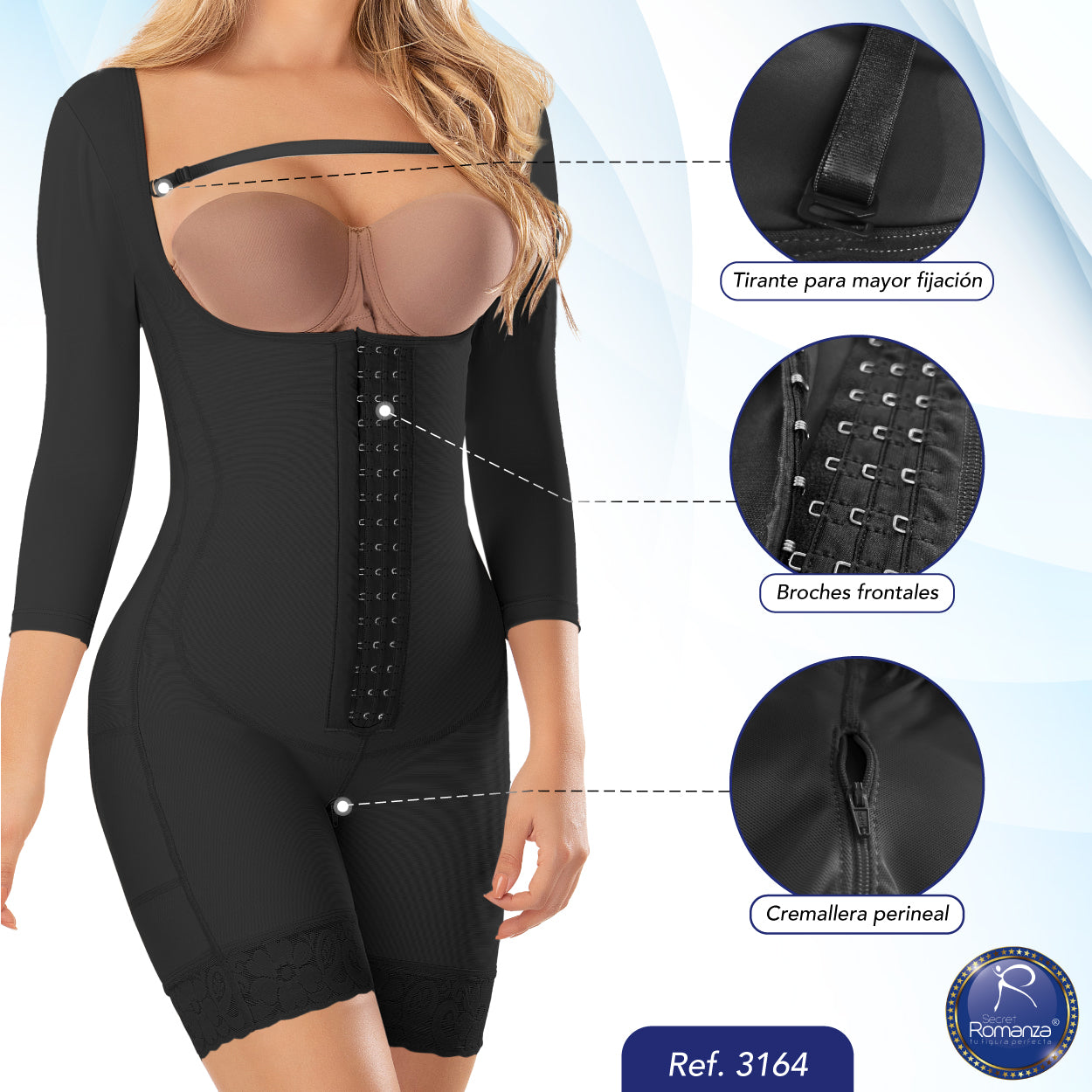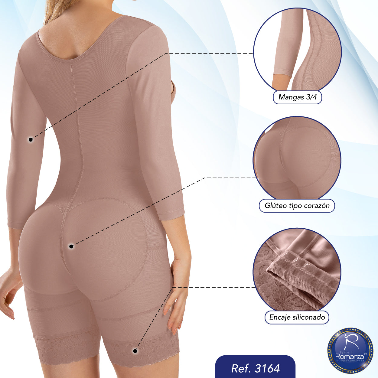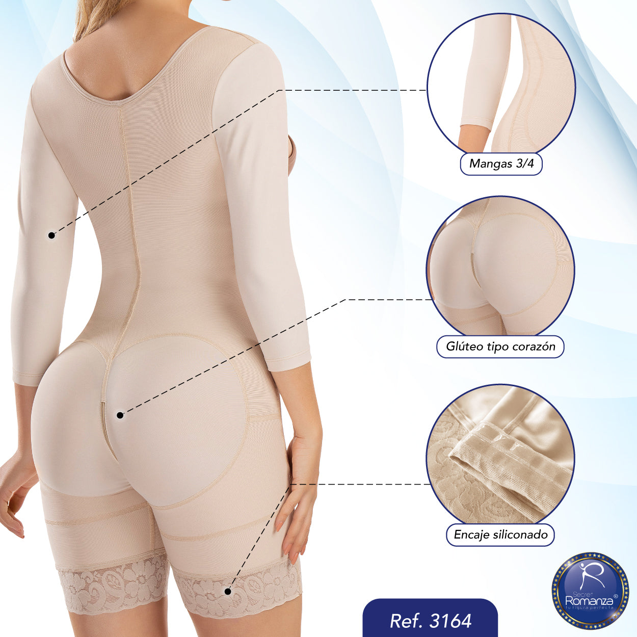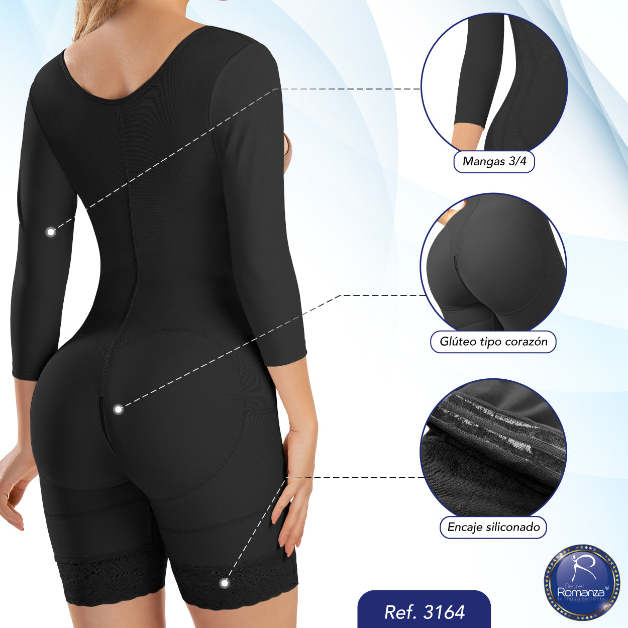 Faja Short postquirúrgico senos libres con mangas, elaborado en powernet. Realza los Glúteos en forma de corazón, Encaje siliconado en las piernas, Broches de 3 líneas frontales y cremallera perineal.