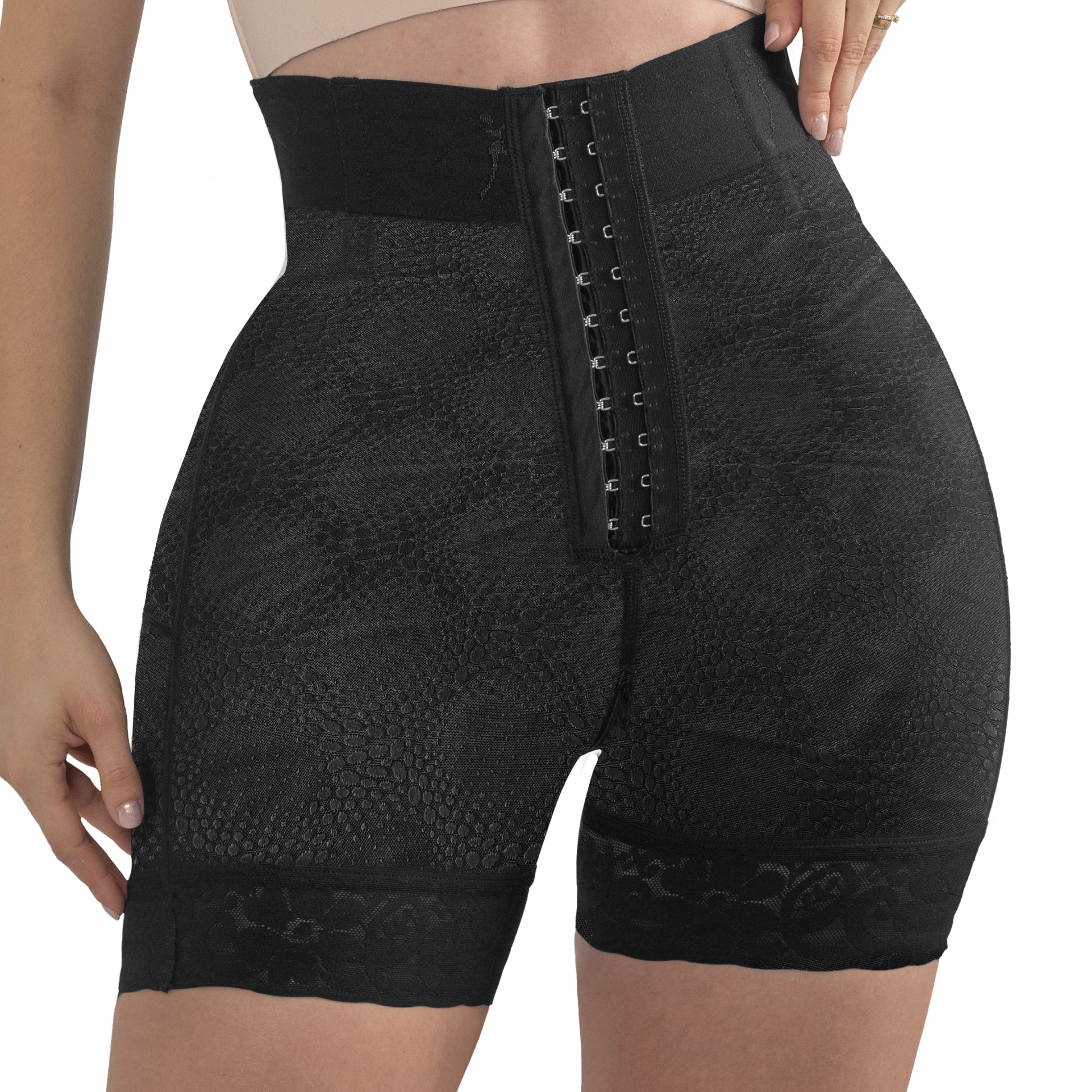 Short de control postquirúrgico diseñado para realzar la figura y favorecer la recuperación. Confeccionado con un elástico siliconado en la parte superior, cuenta con varillas plásticas para soporte adicional y una abertura perineal con zipper para mayor comodidad. Ideal para moldear la cintura, levantar los glúteos y proporcionar soporte a la zona abdominal.